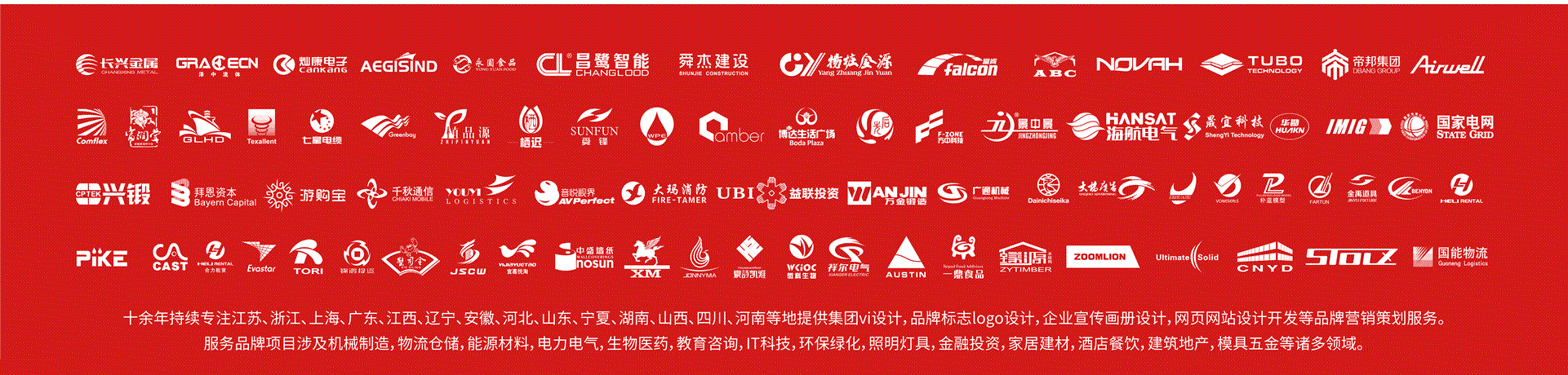 機械制造,物流倉儲,新能源新材料,電力電氣,生物醫(yī)藥,工業(yè)設(shè)備,教育咨詢,IT科技,環(huán)保綠化,照明燈具,金融投資,家居建材,酒店餐飲,房地產(chǎn),汽車,模具五金,工程建筑,水處理,大氣污染治理等行業(yè)集團公司提供集團vi設(shè)計,logo設(shè)計,商標標志設(shè)計,企業(yè)樣本,宣傳宣傳冊設(shè)計印刷,包裝設(shè)計,品牌營銷策劃,企業(yè)網(wǎng)站開發(fā)服務(wù)。