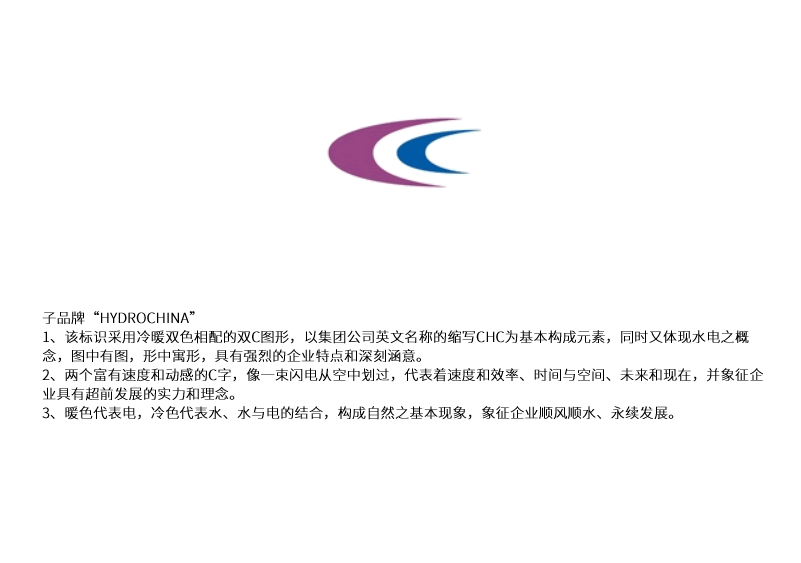 1、該標(biāo)識(shí)采用冷暖雙色相配的雙C圖形,以集團(tuán)公司英文名稱的縮寫CHC為基本構(gòu)成元素,同時(shí)又體現(xiàn)水電之概念,圖中有圖,形中寓形,具有強(qiáng)烈的企業(yè)特點(diǎn)和深刻涵意。