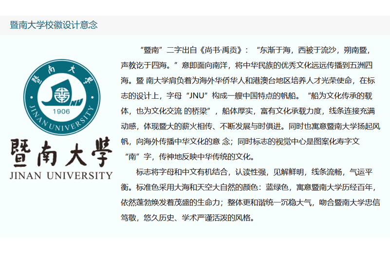 標志將字母和中文有機結合,認讀性強,見解鮮明,線條流暢,氣運平衡。標準色采用大海和天空大自然的顏色:藍綠色,寓意暨南大學歷經百年,依然蓬勃煥發著茂盛的生命力;整體更和諧統一沉穩大氣,吻合暨南大學忠信篤敬,悠久歷史、學術嚴謹活潑的風格。