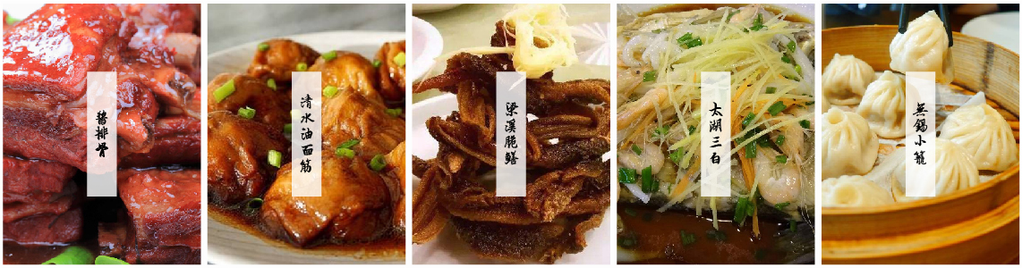 無錫美食:梅花糕、醬排骨、無錫小籠包、清水油面筋、三鮮餛飩、玉蘭餅、梁溪脆鱔、無錫三白、蘿卜絲餅、雞子大餅